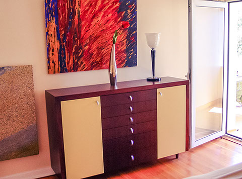Exquisitely furnished, along with kitchen utensils, pots and pans, crockery, cutlery, glasses, hangers, microwave, coffee machine, toaster, washing machine, tumble dryer, dish washer etc. The main bedroom has a King-size bed, the second bedroom a Queen-size bed. Excludes linen.